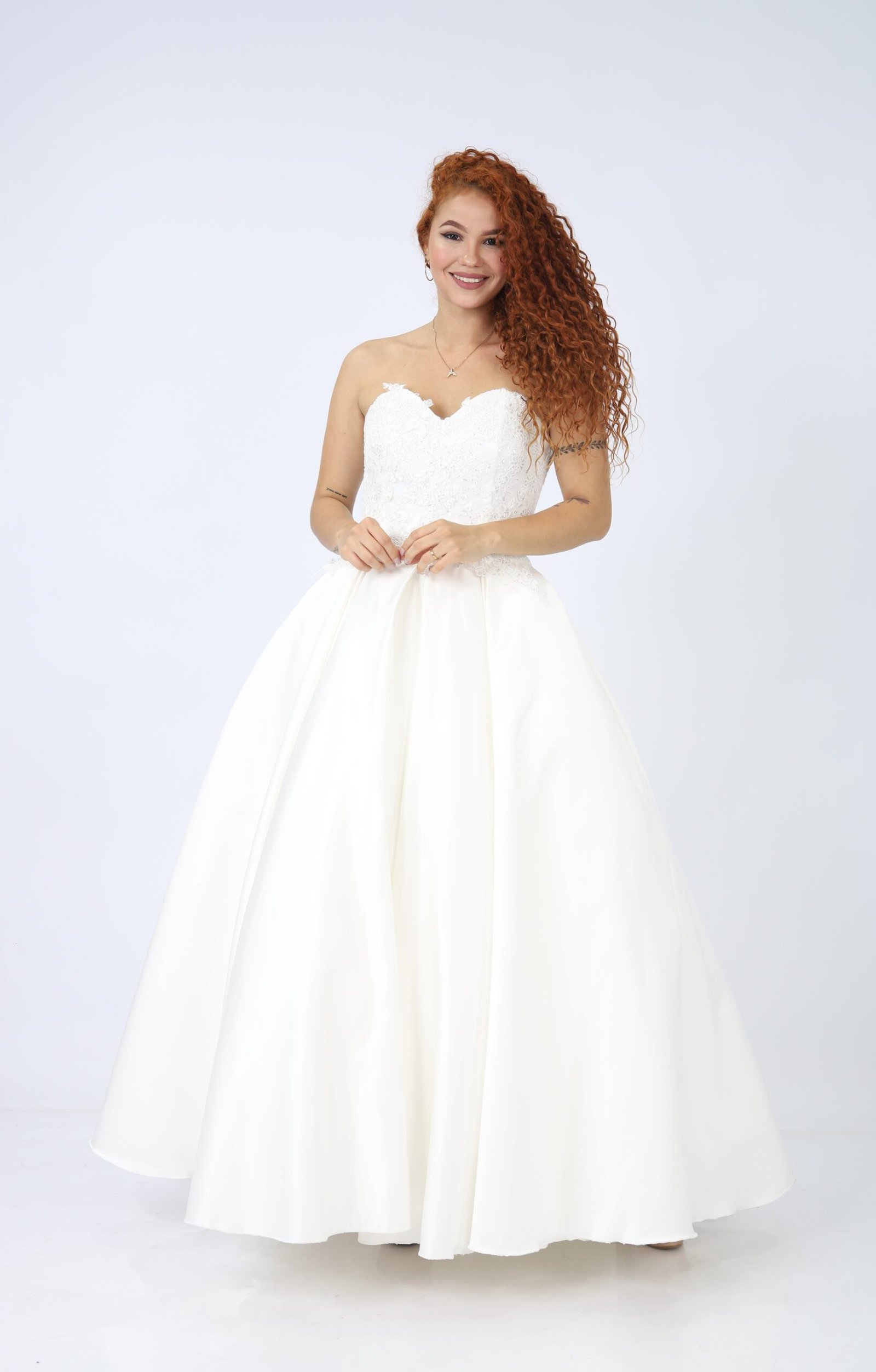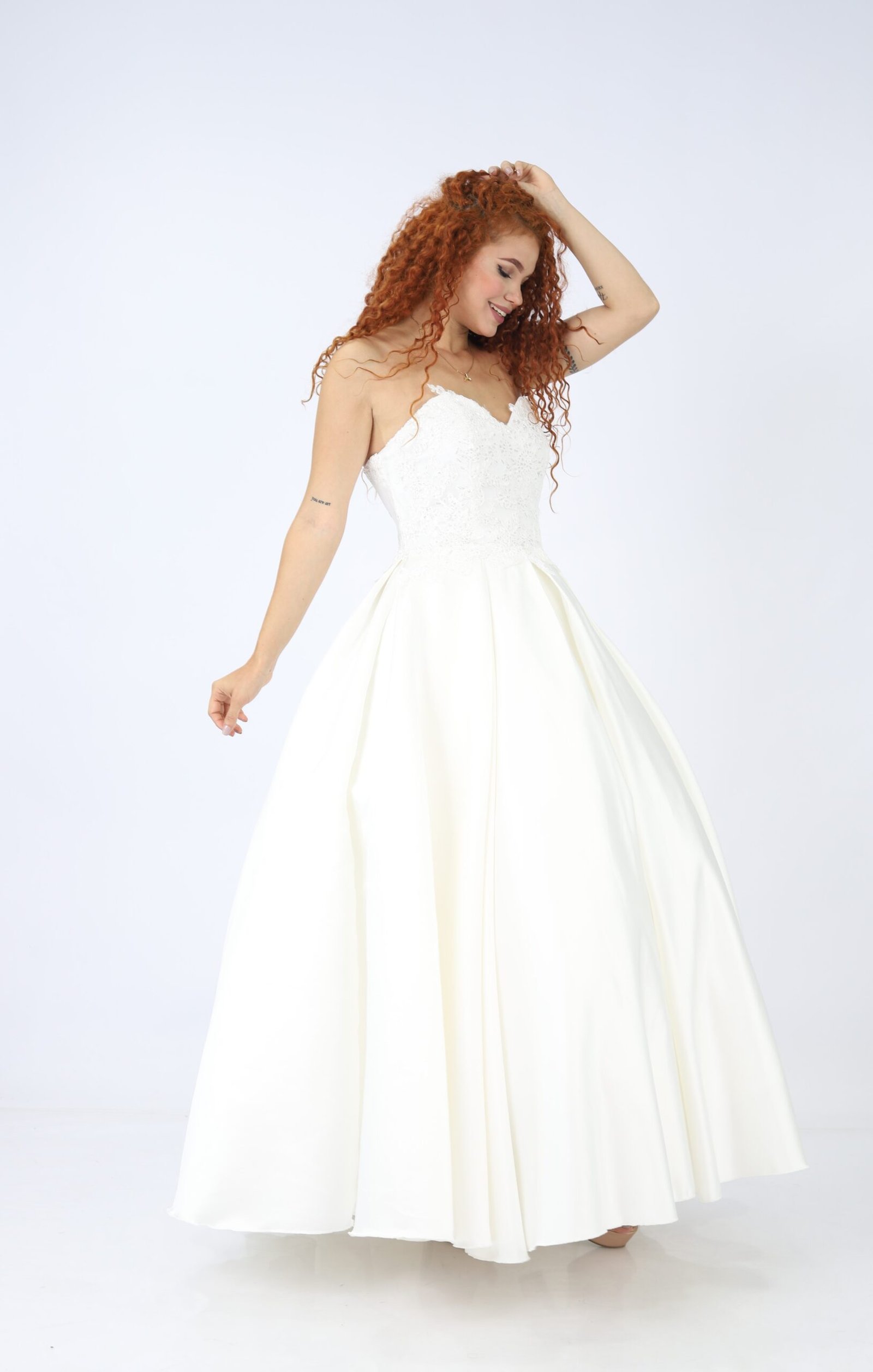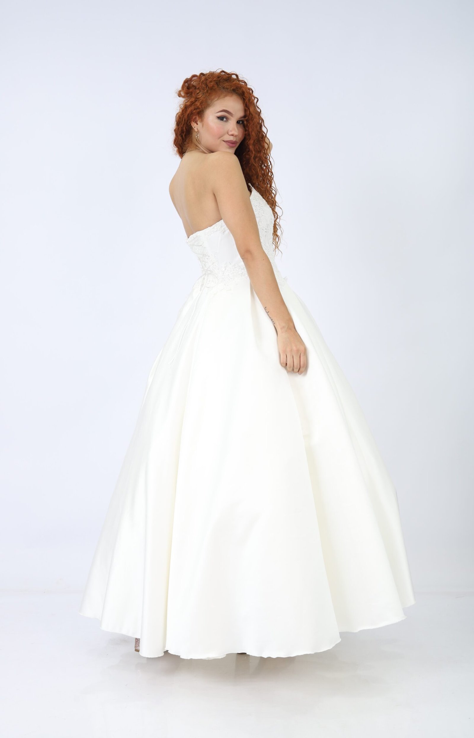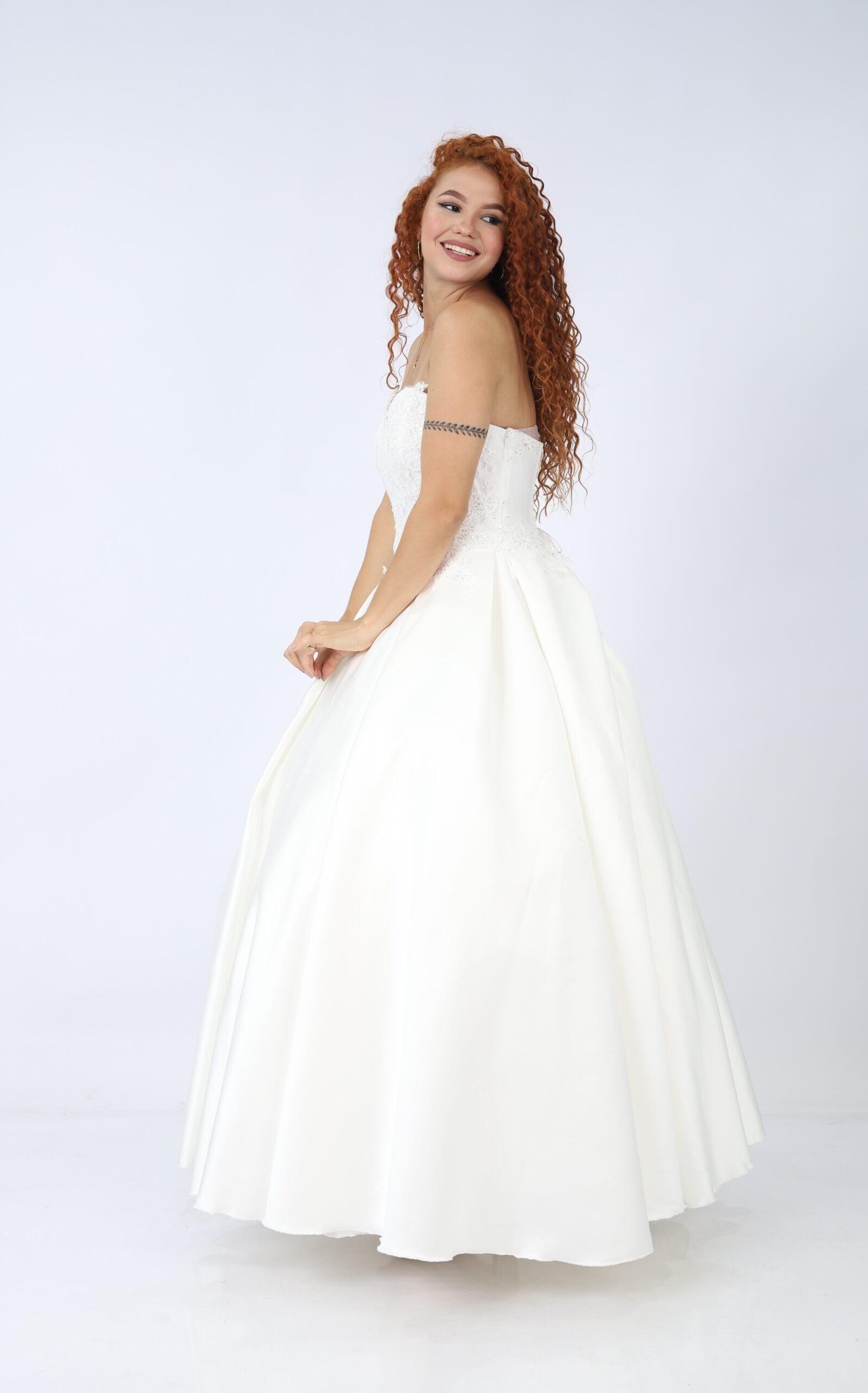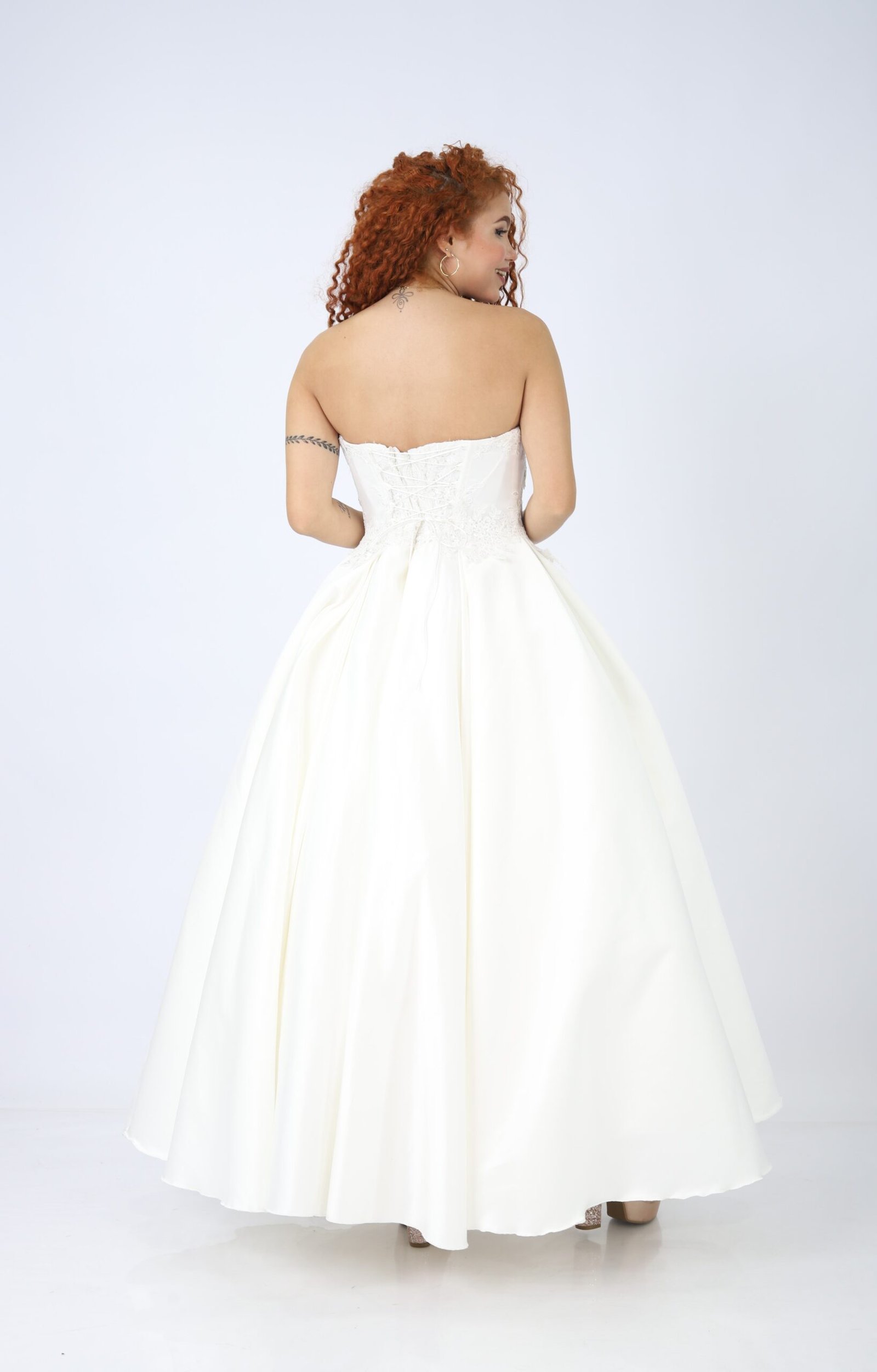 El corazón de este diseño radica en los materiales sofisticados que lo conforman. La parte superior está adornada con elegante encaje bruselas, un tejido que resalta la delicadeza y exclusividad de su aspecto. Además, el forro strapless realza la comodidad y el ajuste perfecto, cuidando cada detalle para destacar tu silueta. La falda está elaborada en tela podosua de alta calidad, complementada con un corte mundo que refleja dinamismo y gracia en tus movimientos.